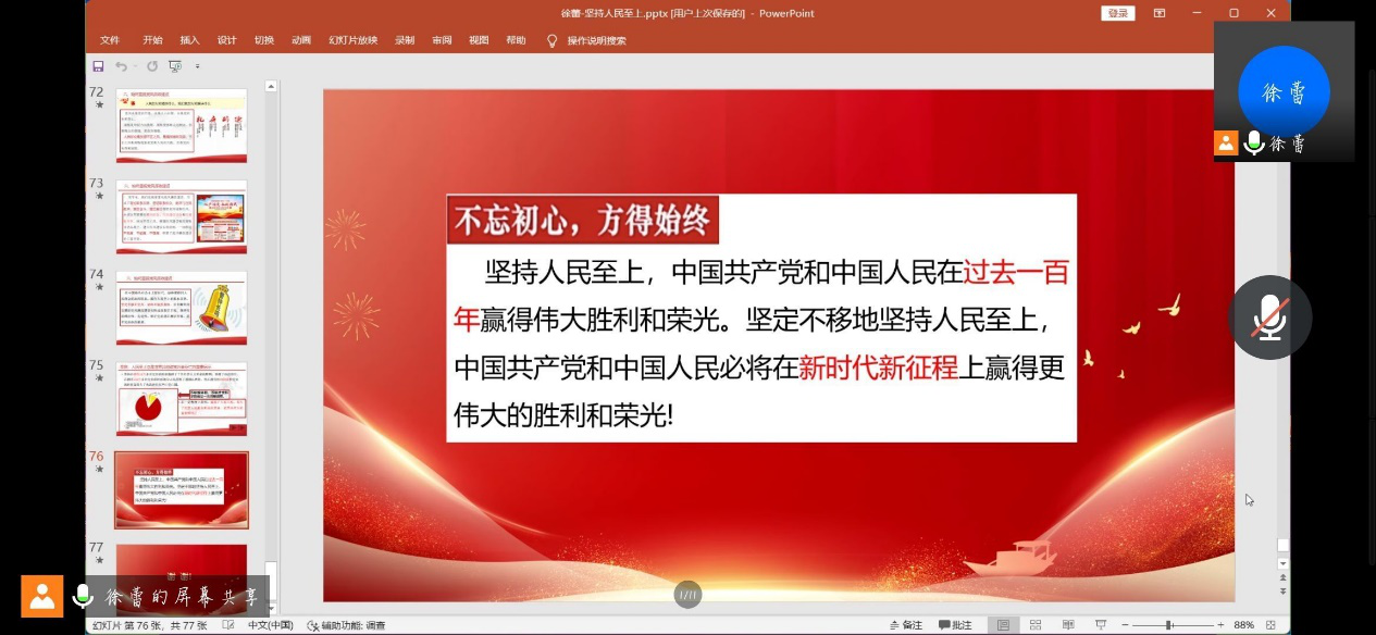 best365网页版党委书记徐蕾同志从“坚持人民至上是党百年不变的初心使命、人民至上的丰富内涵、新征程上必须毫不动摇地坚持人民至上”三个方面向学员传达了“坚持人民至上”的重要性。徐书记从“十个坚持”的主要内容中引出人民至上的重要地位,再从人民至上科学理论的构建到根本价值的实践,并详细解读了《中共中央关于党的百年奋斗重大成就和历史经验的决议》中“坚持人民至上”的内涵与意义,“党的根基在人民、血脉在人民、力量在人民,人民是党执政兴国的最大底气。”并附视频资料以便于大家理解,“半条棉被”的故事深入人心,帮助大家更好的理解了党和人民“鱼和水”的关系。最后呼吁全体学员要不忘初心,坚持人民至上。坚定不移地坚持人民至上,中国共产党和中国人民必将在新时代新征程上赢得更伟大的胜利和荣光!“坚持人民至上”居于十分重要的地位,有着深厚的实践基础、丰富的理论内涵和重大的历史意义,是新时代新征程我们党的事业继续发展壮大的重要遵循,需要认真学习、深入理解、大力弘扬。
