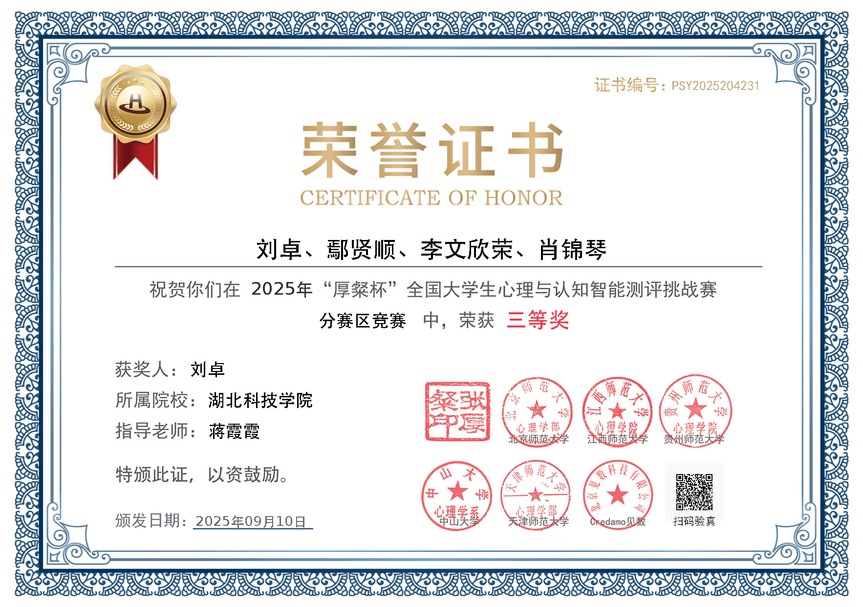 (通讯员:蒋霞霞 审核:俞佳君)2025年11月15日,第三届全国大学生心理与行为在线实验精英赛总决赛在中央财经大学学院南路校区圆满落幕。经过激烈角逐,由我校2023级应用心理学专业刘卓同学带领的“决策灯塔”团队,凭借其作品《大学生网络群体讨论中计划归因偏差的干预研究》脱颖而出,荣获全国三等奖,展现了我校学子扎实的专业素养和卓越的创新能力。