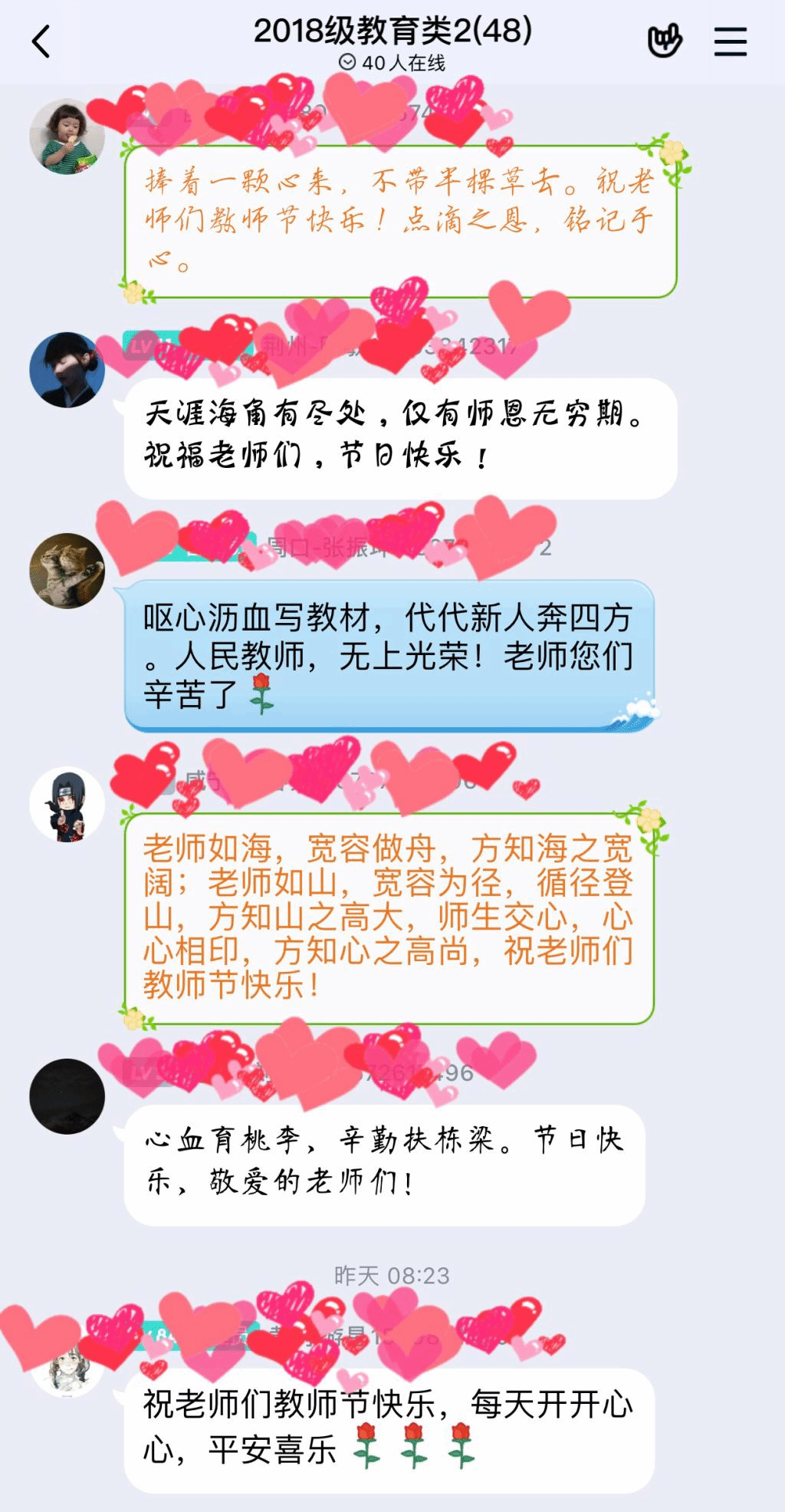 在活动中,best365网页版的每一位同学都表达了自己对老师深深的感激与敬爱之情。在线上,19学前中职班的杨琪说:“老师,您把我像春天的幼苗灌养,用夏天的甘泉把我培养,看着我秋天收获的辉煌,心如冬雪纯洁把我赞扬;谢谢您,可敬的老师,祝您教师节快乐!”18小学教育的徐晓艳说:“在这特别的日子,我想向您致以永恒的感激之情,三尺讲台育桃李,一片丹心铸栋梁,谢谢您老师,祝您节日快乐,幸福永远!”在线下,也有学生为老师献上了自己精心准备的贺卡,表达学生们对老师的祝福和感激之情。饮其流者怀其源,学其成时念吾师,在这一天里,师生情在心与心之间的交流中蔓延开来,在校园的每一个角落下芬芳,馨香满园。