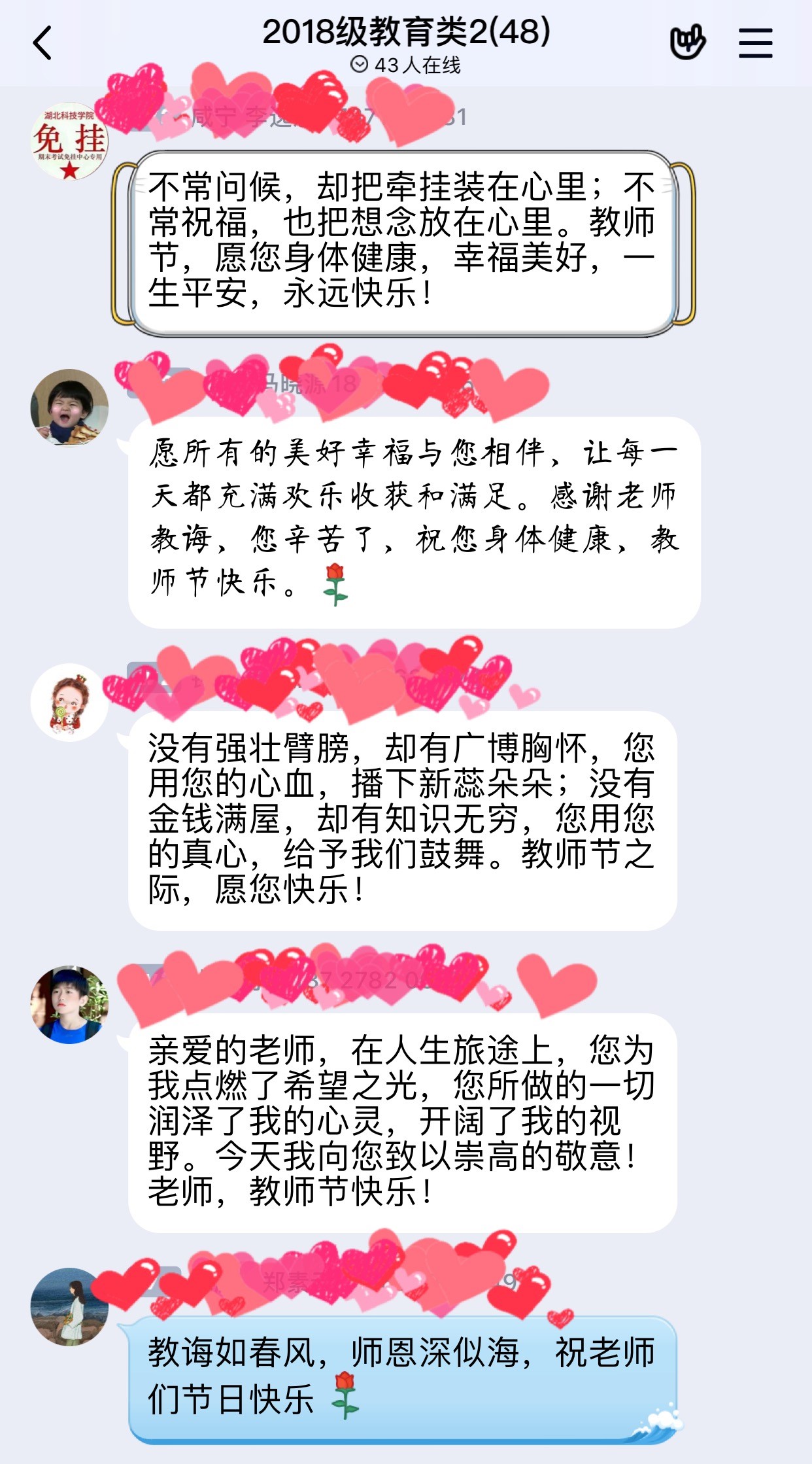 在秋风飒爽的日子里,教师节踏着轻盈的脚步向我们翩翩走来。尊师重教是中华传统美德,为了弘扬新时代尊师风尚,让每名学生感念老师的辛苦付出,铭记老师的温暖关怀,湖科学子纷纷送上对老师们的祝福,best365网页版的全体同学也以简单的形式,最真挚的祝福来感谢老师,以此回报老师的教导之恩,培养之情。