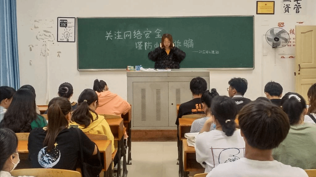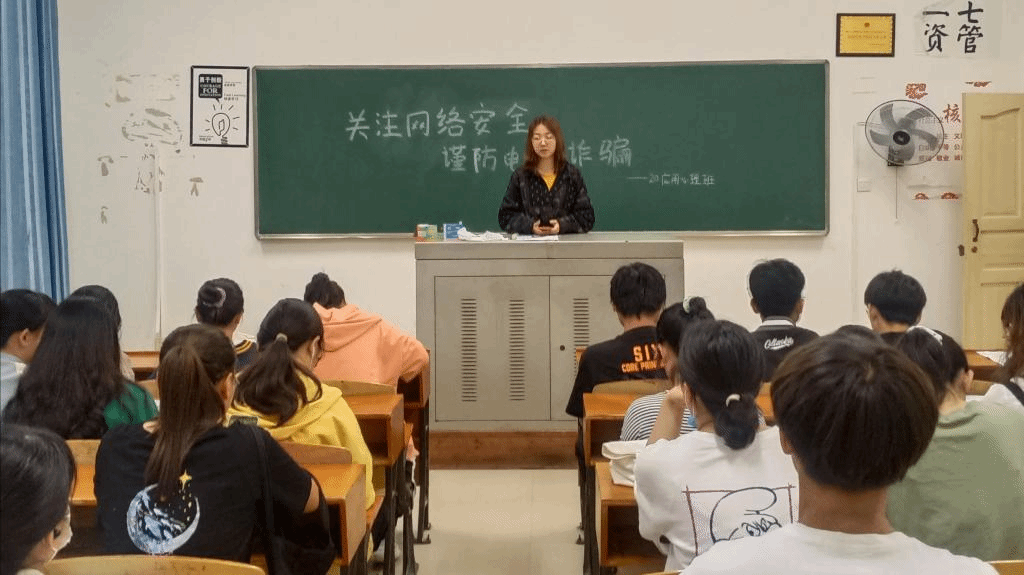 首先,团支书向同学们讲述了《防范电信网络诈骗宣传手册》的内容,介绍了十种常见的电信网络诈骗类型,揭批了诈骗犯罪手法、解析了典型案例,同时进行了防骗提示。其次,团支书组织同学们观看校园反诈宣传视频,通过视频的形式同学们进一步了解了常见诈骗手段,加强了同学们对网络电信诈骗的防范意识。最后,班级同学结合亲身经历提到自己曾遇到过的电信网络诈骗,呼吁同学们遇到实际问题忌盲目,多思考,不要被假象所迷惑。