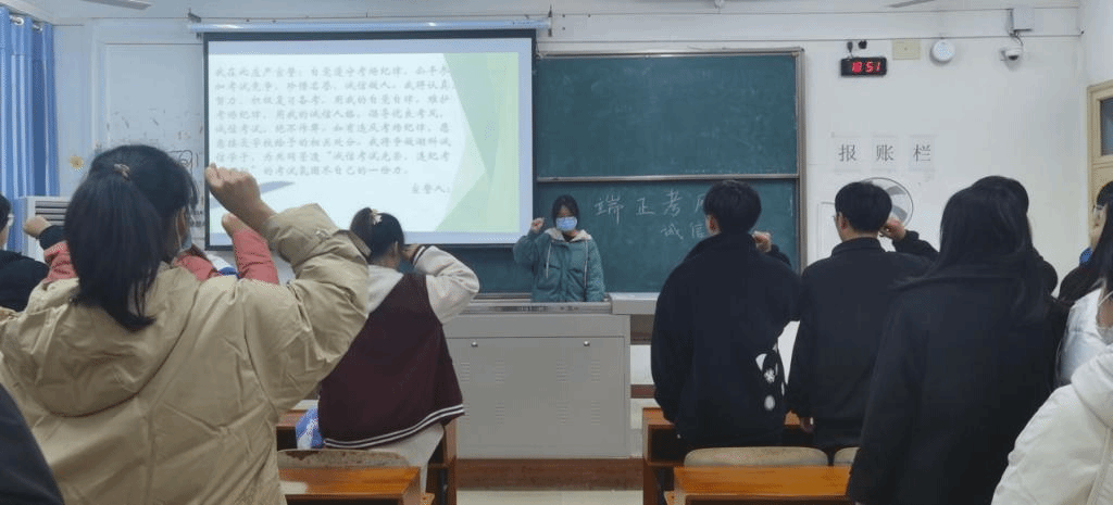 本次活动内容由各班学习委员引导大家学习。活动由诚信考试的意义,考试规则及诚信宣誓三个板块构成,并在其中穿插了两个视频作为案例警示教育材料。