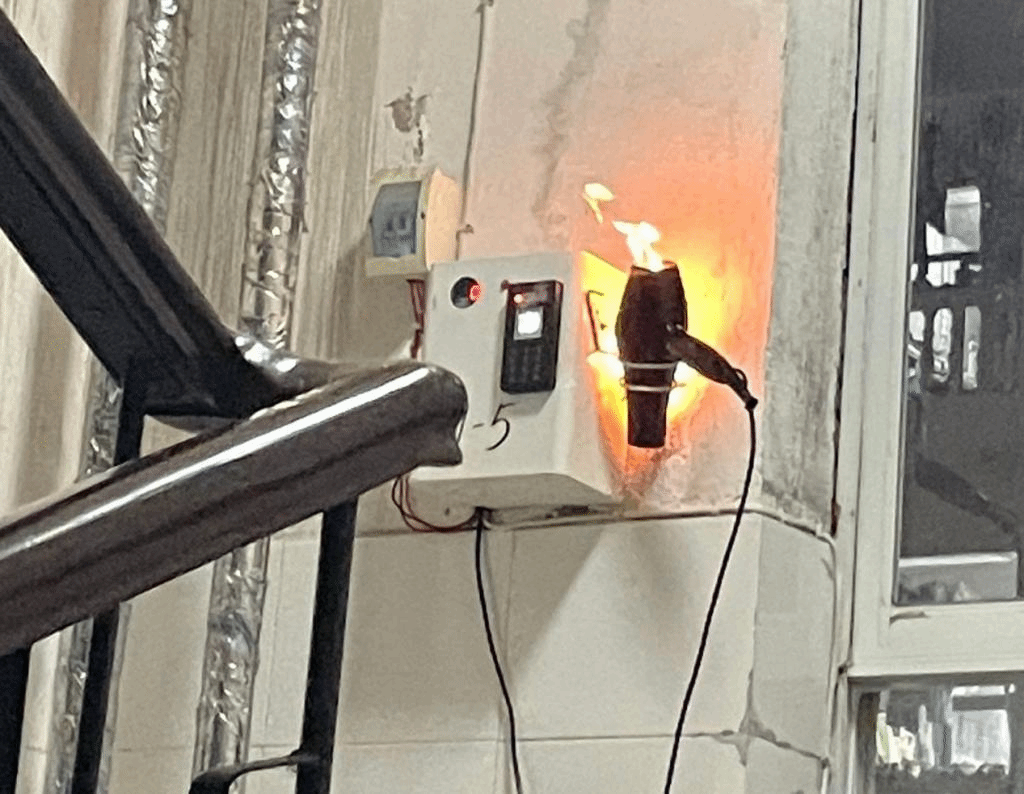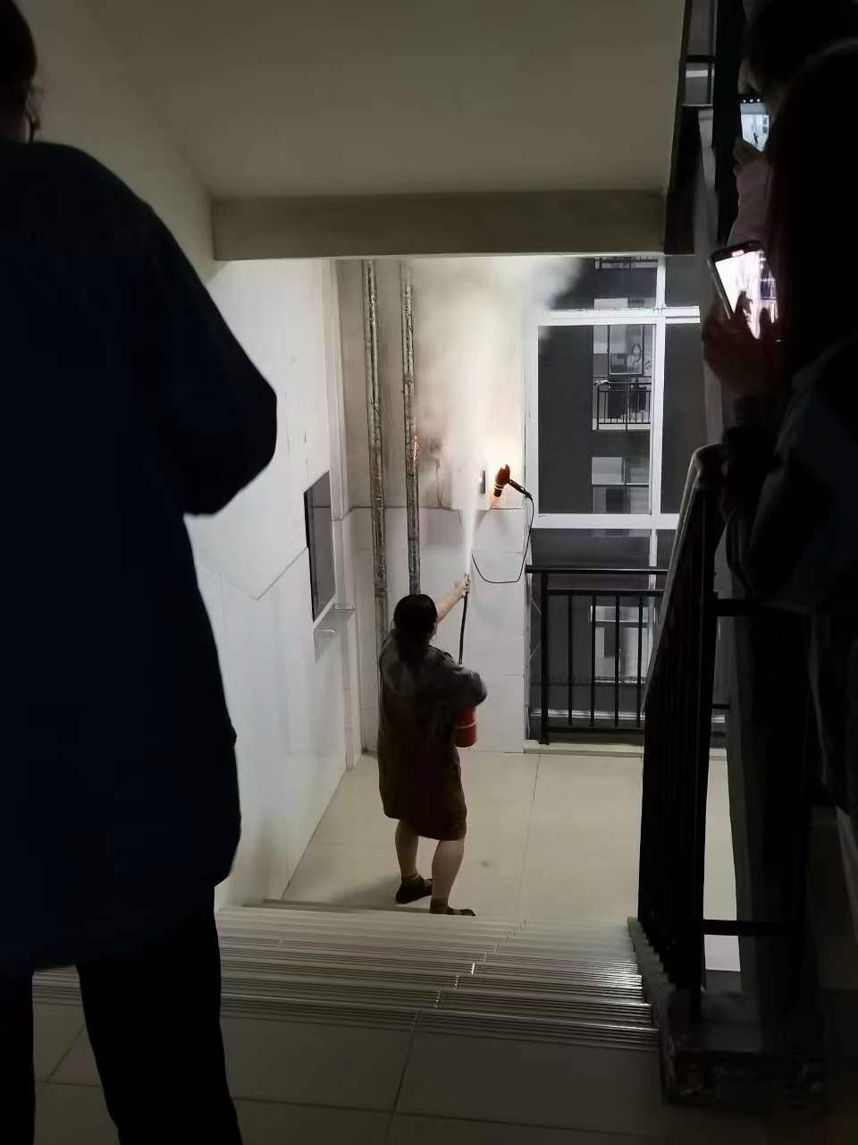 2022年4月28日星期四晚8:40西区公寓9栋4楼楼梯口吹风机因电路负荷大引发火情,情况十分危急,best365网页版郭练同学在五楼查寝过程中闻到一股焦味,听到有同学们传来“着火了”的呼喊声,立刻冲了下去。正在大家惊慌失措时郭练同学冷静地取出楼梯口的灭火器,运用自己掌握的消防技能,短短几分钟就干脆利落地控制住了火势,成功解决危机。