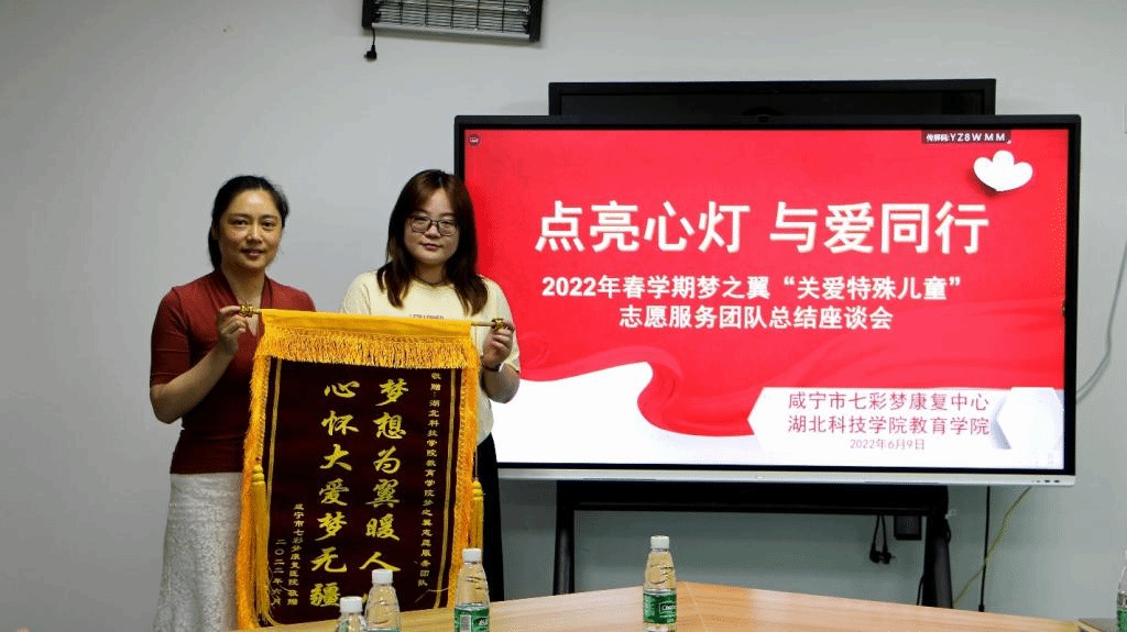 本次座谈会主要分为四个部分。首先,吕园长对所有用行动践行初心、用无私奉献爱心的志愿者们表示崇高的敬意和真心的感谢。其次,“梦之翼”团队代表全嘉丽同学通过展示PPT介绍梦之翼团队,并汇报春季学期在七彩梦康复中心志愿服务活动开展情况。接着,志愿者代表秦靖、蔡昭阳表达了个人参与服务的无私奉献初心,并结合近期志愿服务工作中存在的问题积极建言献策,为接下来的志愿服务工作提出了宝贵的意见和建议。郑珍老师和孙和平院长认真听取汇报及工作建议,亲切与志愿者们交流,并提出相关意见和建议。同时,徐蕾书记也对梦之翼志愿者团队阶段性服务表示祝贺,希望志愿者们秉承志愿服务精神,尊重所有儿童,提升服务的质量,发挥专业的特长,把这个活动办得更有深度内涵。活动最后,大家共同商议暑期志愿服务活动开展及秋季学期活动计划,并由吕秀平园长给老师和志愿者们颁发锦旗和证书。