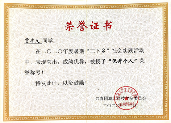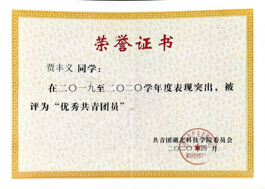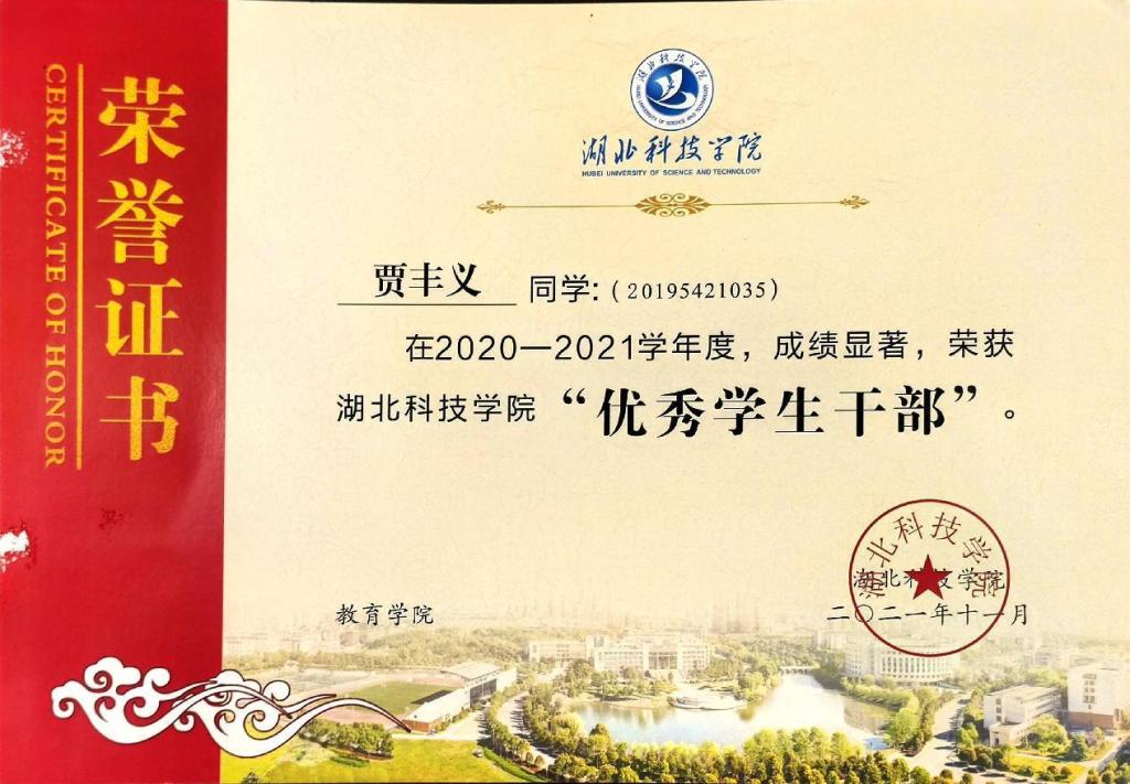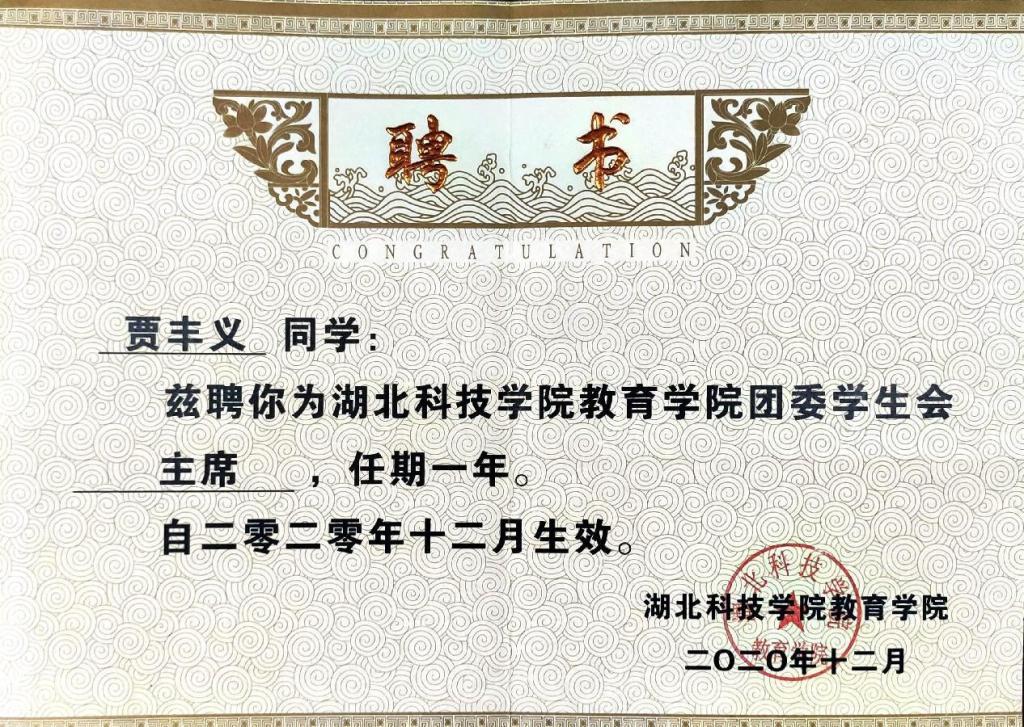 贾丰义,男,汉族,2001年5月出生,中共预备党员,best365网页版,best365网页版学前教育专业2019级本科生。自入学以来曾担任班长、团支部副书记、2020届best365网页版团委学生会主席。学习上努力刻苦,认真钻研。工作上严谨认真,尽职尽责。曾获得校一、二等奖学金、“星耀湖科”年度奉献之星、优秀学生干部、优秀共青团干部、优秀共青团员、优秀大学生、“三下乡”社会实践优秀个人、军训优秀学员等荣誉。荣获“2019年咸宁国际温泉马拉松”志愿服务优秀志愿者、揽月杯舞蹈大赛三等奖等奖项。