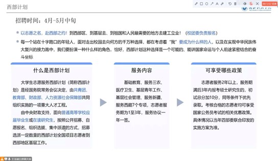 首先,第一个部分“就业形势分析和毕业生就业选择”,王老师分析了2022届毕业生就业情况报告和2023届毕业生就业形势,然后从考编、考公、考研,选调生、大学生西部计划等多种渠道进行讲解,为毕业生提供充分的就业选择。