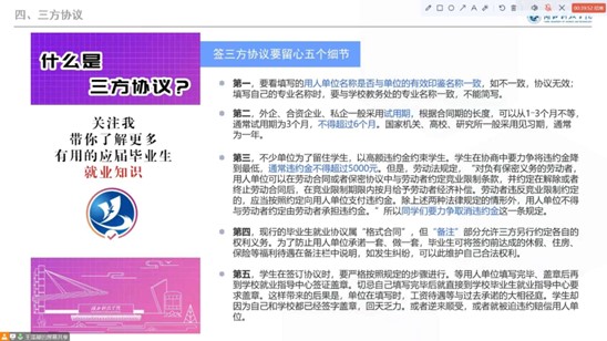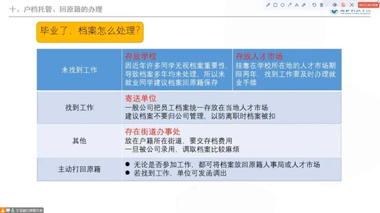 其次,第二部分“毕业生就业须知”中王老师重点细述了劳动合同,就业材料以及三方协议等文件,告诫毕业生在签订相关协议时一定要打起十二分精神来认真研读。同时,也指出了毕业生档案的重要性,提醒毕业生档案有可能变成问题档案乃至死档。