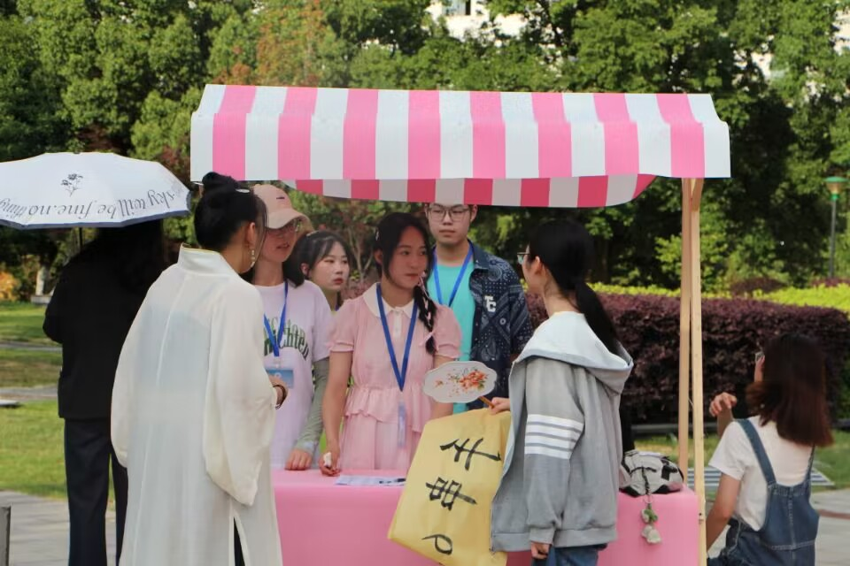 本次活动共设有105个摊位,这些不同类型的摊位分布在揽月广场的四周和路边。当夜幕笼罩校园,活动现场气氛渐渐推入高潮。摊主们早早就将自己的商品摆放好,或是精美的发饰、发夹,或是生机勃勃的绿色植物,或是现场书写的各种美好祝福,或是袅袅茶香的茶水,更有各种惊喜盲盒……活动现场各摊主激情饱满地吆喝着,许多人纷纷驻足在自己感兴趣的摊位上,或是欣赏着揽月广场正中心的舞蹈,期间还有穿着青蛙服的人在各个摊位游走,吸引许多同学的注意。舞蹈《我们向快乐出发》绽放出青春活力。各位摊主充满激情的吆喝声、路过的同学兴致盎然的询问声和广场中央的音乐舞蹈交相融汇,活动现场气氛达到高潮。