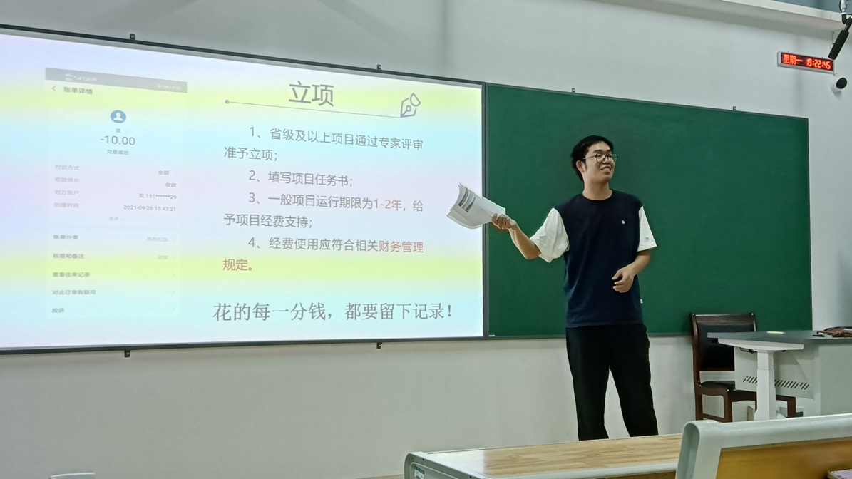 会上,侯永发同学讲解了近期的第十四届挑战杯竞赛申报的注意事项和详细过程,介绍了“小挑”和“大挑”的区别,说明这类活动的含金量和目的,鼓励学以致用,勇敢尝试。侯永发同学强调:创新离我们并不遥远,就在日常生活中,只要我们大胆的将自己的想法写下来,符合参赛要求,在大赛中获得奖项是没有问题的。