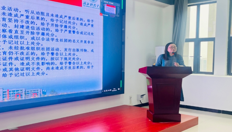 作为刚步入大学的新生,更应该从校纪校规中学习文明习惯,学校是接受知识的平台,校规校纪尤为重要。孙萍老师首先由《学生教育管理制度汇编》入手,向新生讲述了最基本的学生违纪的判定和处分方法,告诫学生,不断完善自我,规范自身行为。同时,孙萍老师强调了学生应将学习放在第一位,建立良好学纪学风,杜绝迟到早退,旷课逃课的现象,最后,孙萍老师鼓励新生,在经营好大学生活的同时,在大学里出一份力,发一份热。希望同学们可以做一名积极上进的大学生,在自己的大学生活里划上浓墨重彩的一笔。