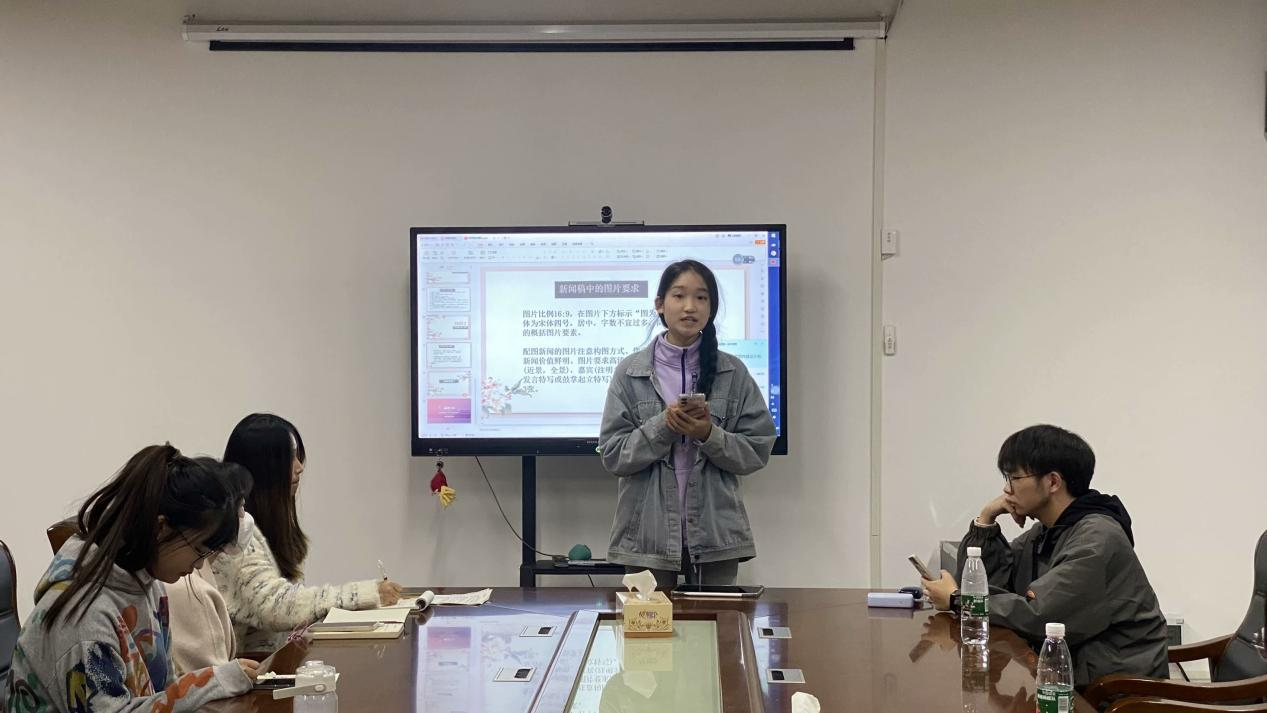 接着,新媒体的新老成员进行自我介绍,编辑部、记者团、宣传部、技术部等四个部门的部长分别对前一阶段的工作进行总结陈述并指出工作中遇到的问题,对新成员提出相关改进要求,并布置了工作任务。接着,各部门部长依次开展了部门业务技能培训,她们分别从图片拍摄、文稿撰写、图文排版、视频制作等方面进行详细介绍,面对新成员的提问,她们都给予了耐心的解答与指导。随后,新干事进行近期热点汇报和节气海报展示,大家一起对新成员制作的二十四节气海报进行点评并提出修改建议。最后,新媒体中心技术顾问王泽巨同学表达了自己对新媒体运营的热情和思考,并从专业角度对视频制作、摄影摄像的相关知识给大家开展了详细的培训。