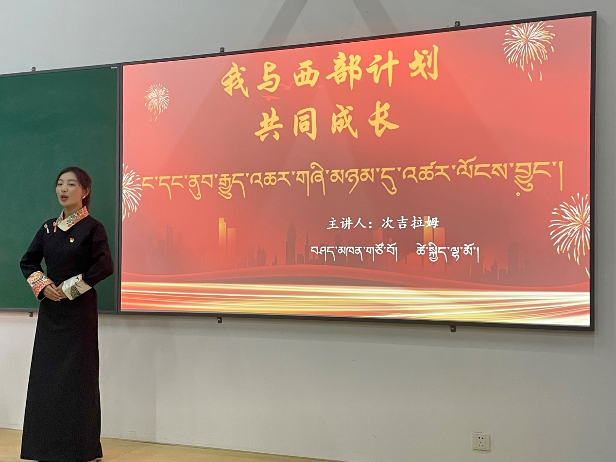 其中,次吉拉姆同学以“西部计划”为主题,分享了自己在成长过程中的经历和思考。她阐述了她与西部计划的经历,带领大家走进了一个西藏青年被西藏计划救赎的感人的故事,让大家感受到祖国的伟大,更深刻的明白,祖国不会放弃任何一位同胞,不会忘记她的任何一个儿女。大家主题鲜明,内容生动,极具感染力的演讲赢得了现场观众的热烈掌声。