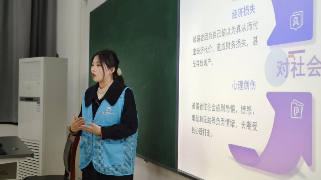 图为程子晏为同学们讲解诈骗的危害