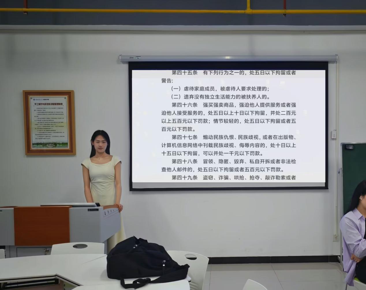 各班心理委员以模仿话术的方式为同学们呈现今晚班会内容。他们将复杂的法律条款转化为贴近学生生活的语言,通过模拟场景、角色扮演等形式,让同学们在轻松愉快的氛围中了解法治知识,加深对霸凌行为危害性的认识。在这样有趣的授课模式下,同学们迅速融入课堂氛围中来,在吸收知识的同时,也将知识与自身生活结合,对校园霸凌这个话题进行了更加深入的思考。