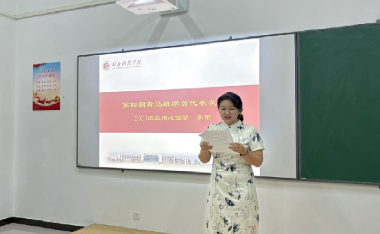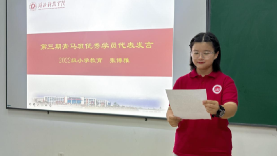 第四项议程,第三期学员代表张博雅发言,她表示身为新时代的接班人,我们每一位青年大学生更应该把握住当下学习的机会,提高专业素养和个人能力,为今后的本职工作打下坚实的基础,做青马思想的传承者,做青马思想的践行者。