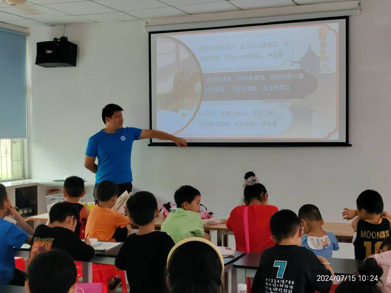 在7月15日上午,阳光透过窗子,教室被照得亮堂堂的,学生们早早来到教室,进入讲述人文风情历史的课程《湖北是我家》。志愿者带领孩子们领略了湖北的基本信息,从地理位置到历史文化,从家乡简称到美食名胜,内容全面。随后,志愿者重点介绍了湖北有名的风俗,如湖北的传统戏剧黄梅戏,著名的非物质文化遗产杨店龙灯等等,孩子们纷纷表示,有机会一定要去看看这些有趣的文化,亲身体验湖北的独特魅力。