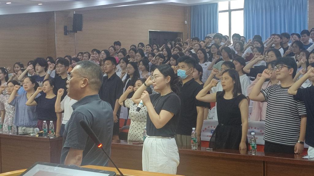 活动进入尾声,刘雨婷博士带领教院教师以及全体24级新生举起右手,庄严宣誓。这一宣誓仪式,不仅是对师范类专业教师的一种激励,更是向24级全体新生传递了一种信念和责任。