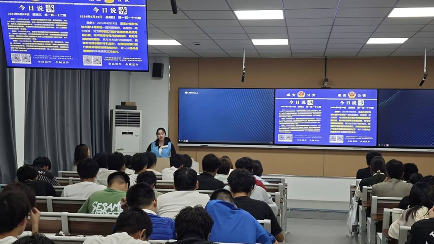 图为主讲人陈鑫玲向同学们讲解诈骗案例