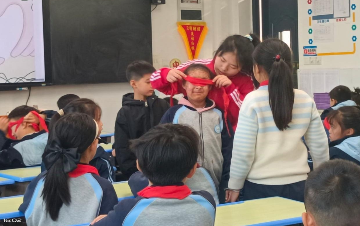 随后,模拟组的志愿者们带领孩子们进行了一场生动的模拟训练。在肢体残疾模拟环节,一位孩子勇敢地用单脚跳跃,在教室的模拟小道上“行走”,其他孩子则在一旁认真观察,深切体会到了肢体残疾者行动的不便与艰辛。在视力障碍模拟环节,孩子们蒙上双眼,尝试完成找座位、辨别方向等简单任务,他们在摸索中感受到了失去视力后的无助与困惑,从而更加珍惜自己拥有的一切。