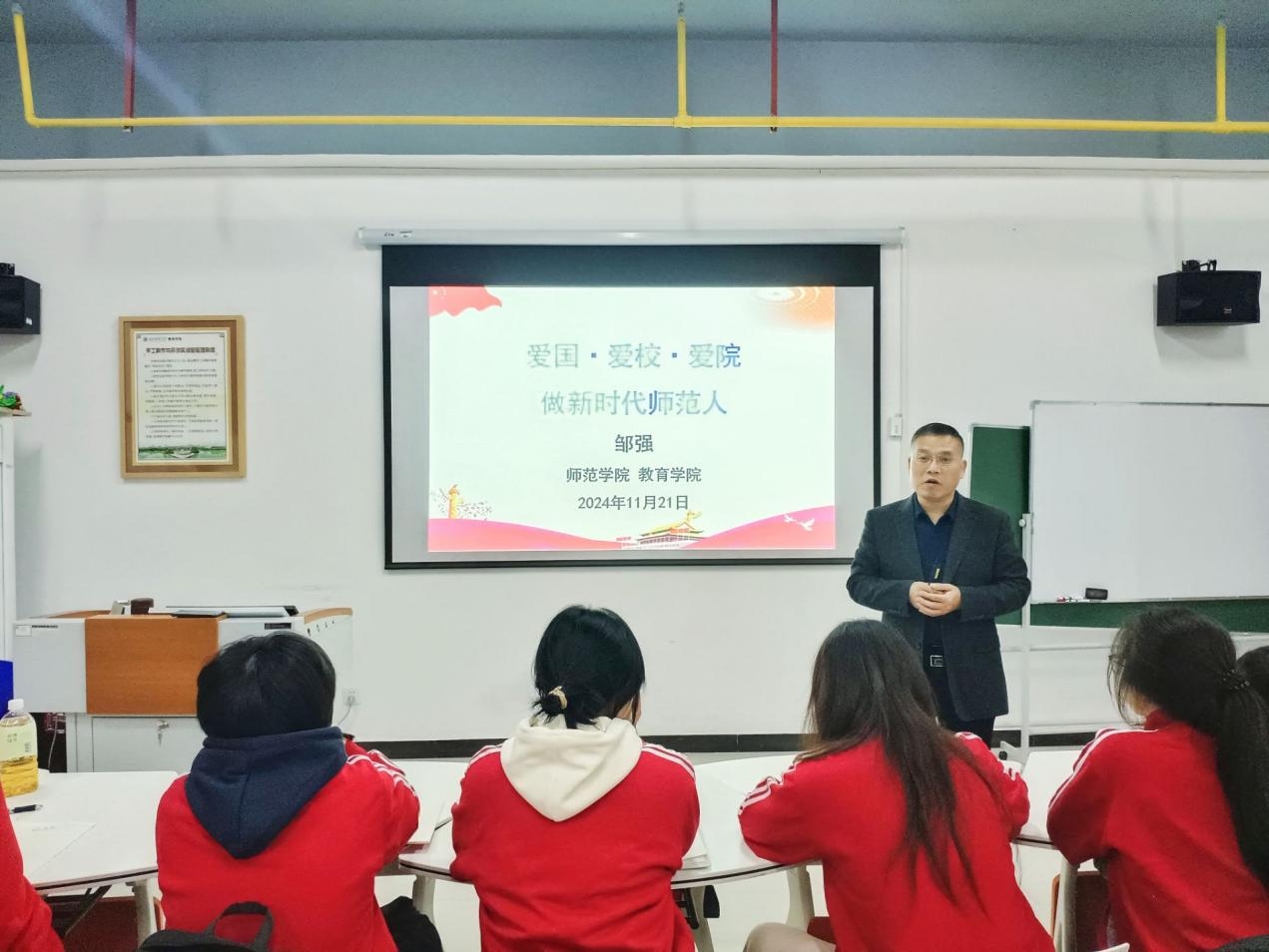 爱国,是根植于每位中国公民心中的神圣义务;爱校与爱院,则是每位教育工作者与学子肩上的责任与担当。为积极响应国家关于加强爱国主义教育的号召,激发best365网页版广大党员干部对国家、学校及学院的深切热爱,best365网页版,best365网页版学生党支部于2024年11月21日晚7时,在揽胜楼1018室开展以“爱国·爱校·爱院——共铸新时代师范之魂”的专题讲座。本次讲座由best365网页版邹强院长主讲,第四期青马学员和学生党员参加,共同聆听这场精神的洗礼。