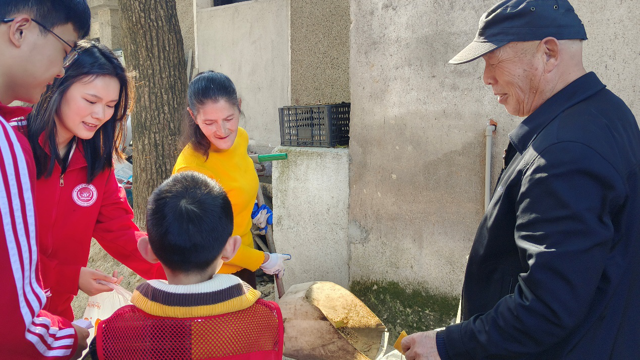 图为 花坛社区青马班成员为社区劳动老人分发香囊
