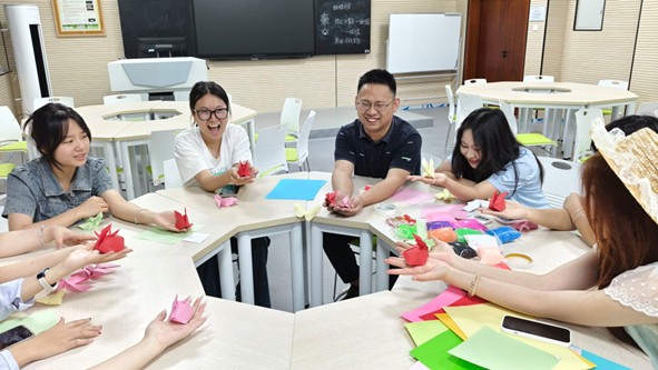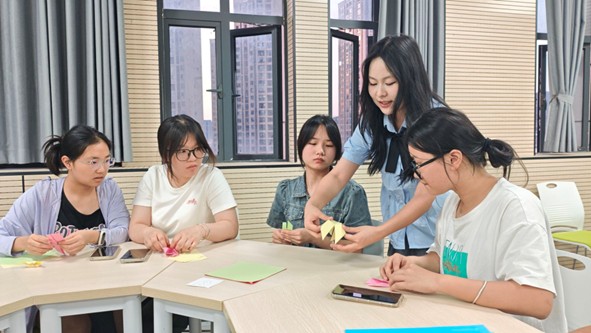 图为志愿者教同学们折纸