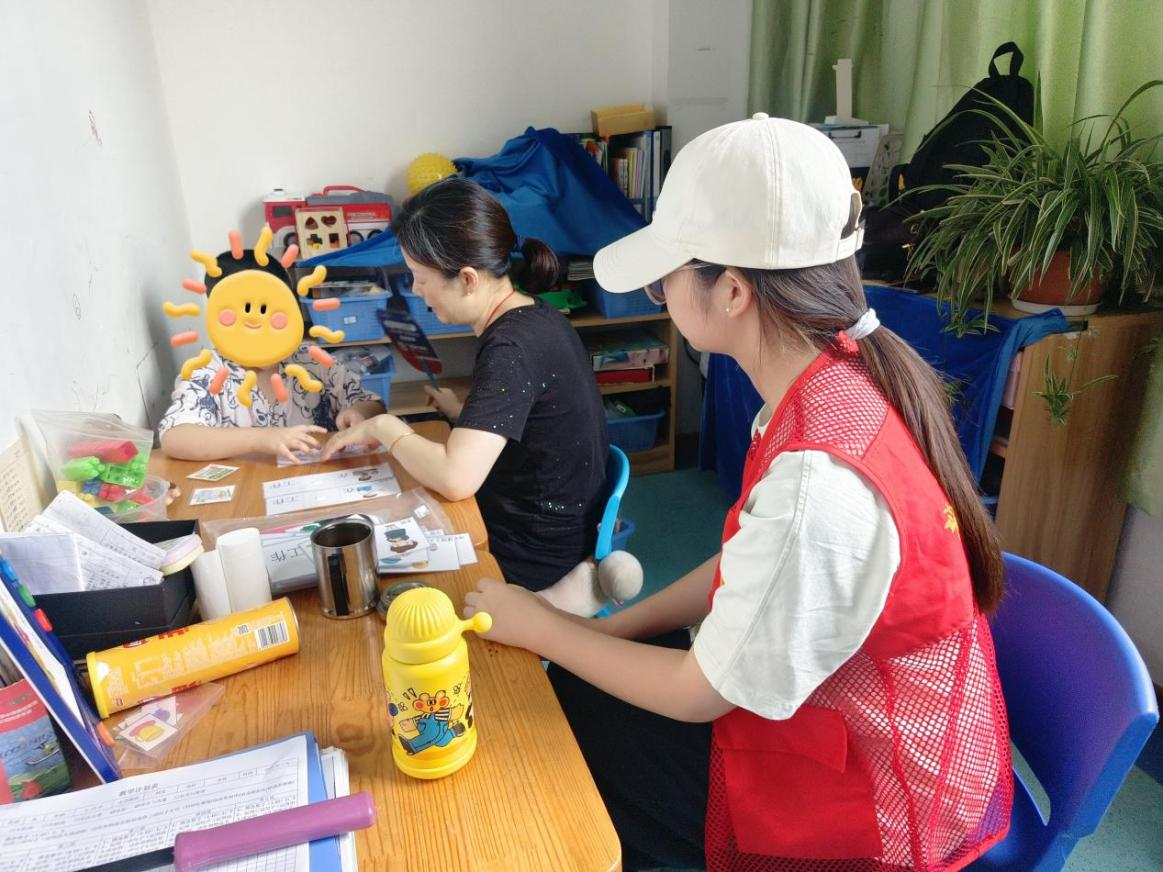 个训室中,蓝色布帘后摆放着各类专业教具,志愿者们辅助治疗师对孩子们进行一对一训练,见证着孩子们从只能发出模糊音节到能清晰喊出“老师好”的显著进步,这背后是无数次耐心引导与不懈坚持的成果。而在感统训练室,数字卡牌游戏成为孩子们打开社交大门的钥匙,孩子们主动递出卡片的瞬间,或是彼此相视一笑的默契时刻,都传递出他们社交能力正在逐步提升的积极信号。