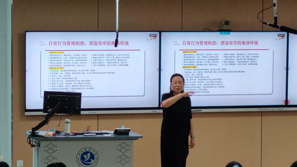 为助力新生尽快融入校园,强化遵规守纪观念,守护校园平安,2025年9月9日,党委副书记孙萍老师为新生带来“遵规守纪,守护平安校园”主题宣讲,全面讲解校园安全、制度规范等内容。