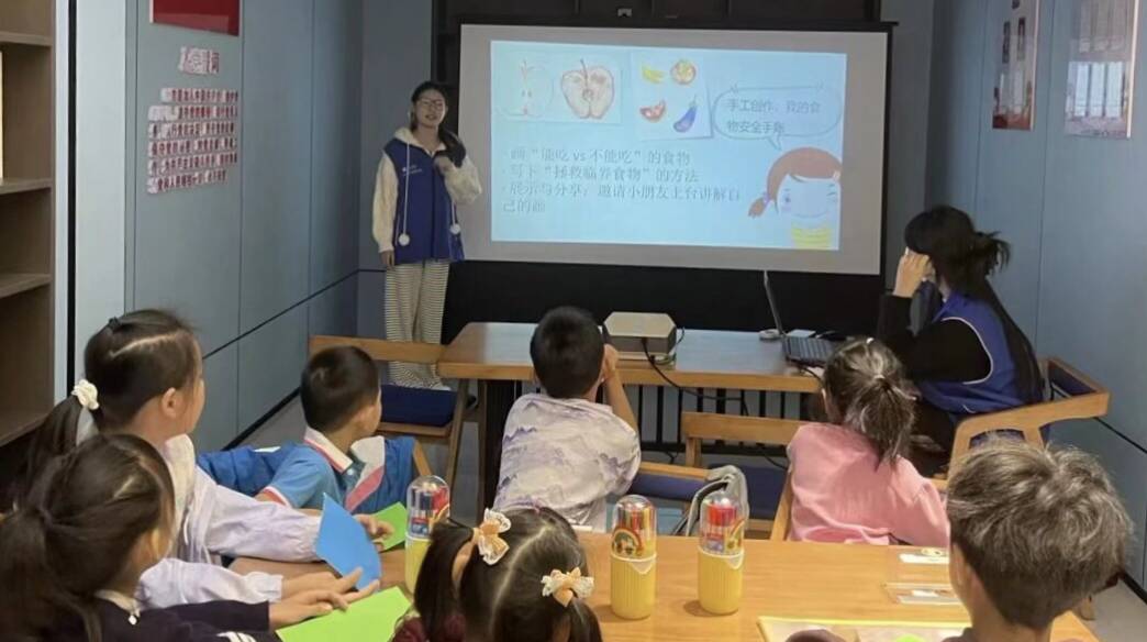 手工环节中,志愿者为孩子们发放画纸与彩笔,引导他们绘制“能吃和不能吃的食物”“拯救临界食物的方法”主题插画,制作专属“食品安全手账”。