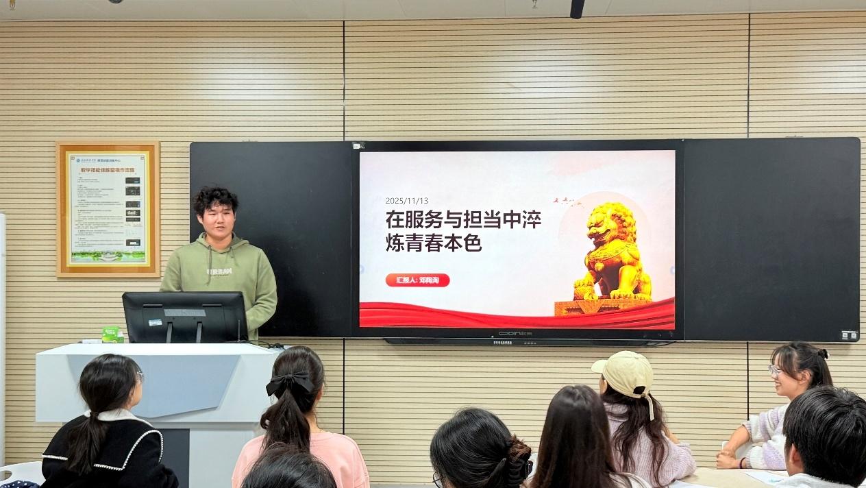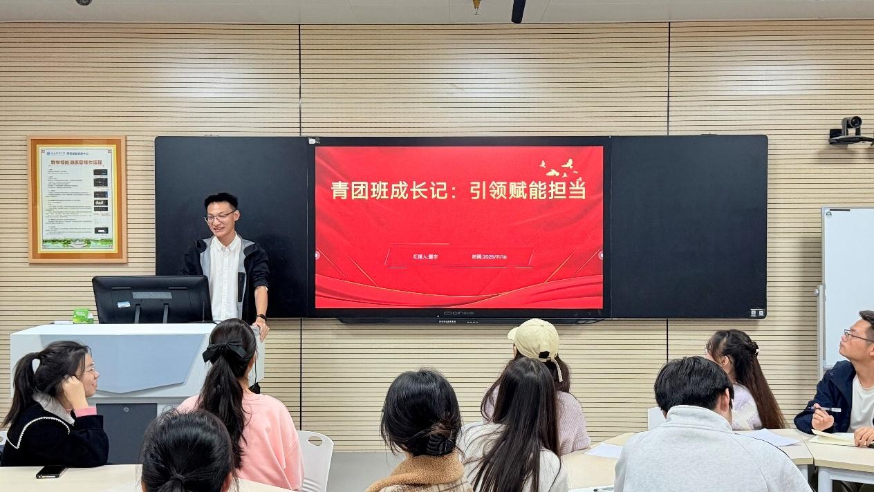 第三组学员的汇报则立足使命担当与未来展望。24小教一班班长陈凯以“践行使命,勇担骨干之责”为核心展开讲述。他结合班长岗位实践,谈及如何在班级管理中担负责任、精进作风,并掷地有声地表示:“'青团班'的结业不是终点,而是我们践行青年担当的新起点”,引发在场学员的强烈共鸣。25小学教育班的邓淘淘则从更宏观的视角切入,深入剖析了青年工作的战略意义,系统阐述了新时代青年工作的目标与实现路径,并针对学生干部需具备的沟通协调、组织策划等核心能力提出了自己的见解,展现了扎实的理论思考能力。