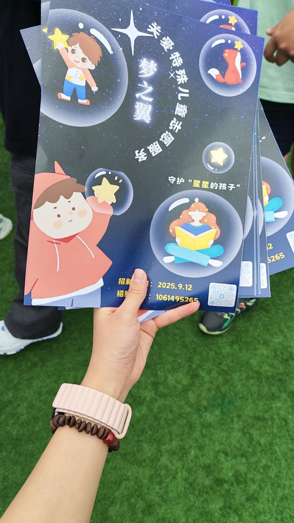 招新现场,社团设置了宣传咨询区、互动体验区及礼品领取区。社员们统一着装、分工明确,以饱满的热情投入工作。有的主动走向人群,发放传单、引导新生了解社团;有的耐心解答关于部门职能、活动类型、入社要求等问题,并结合自身经历分享在梦之翼的成长体验;有的则组织起了“趣味知识问答”“爱心明信片书写”等小型活动,迅速拉近了与新生的距离。