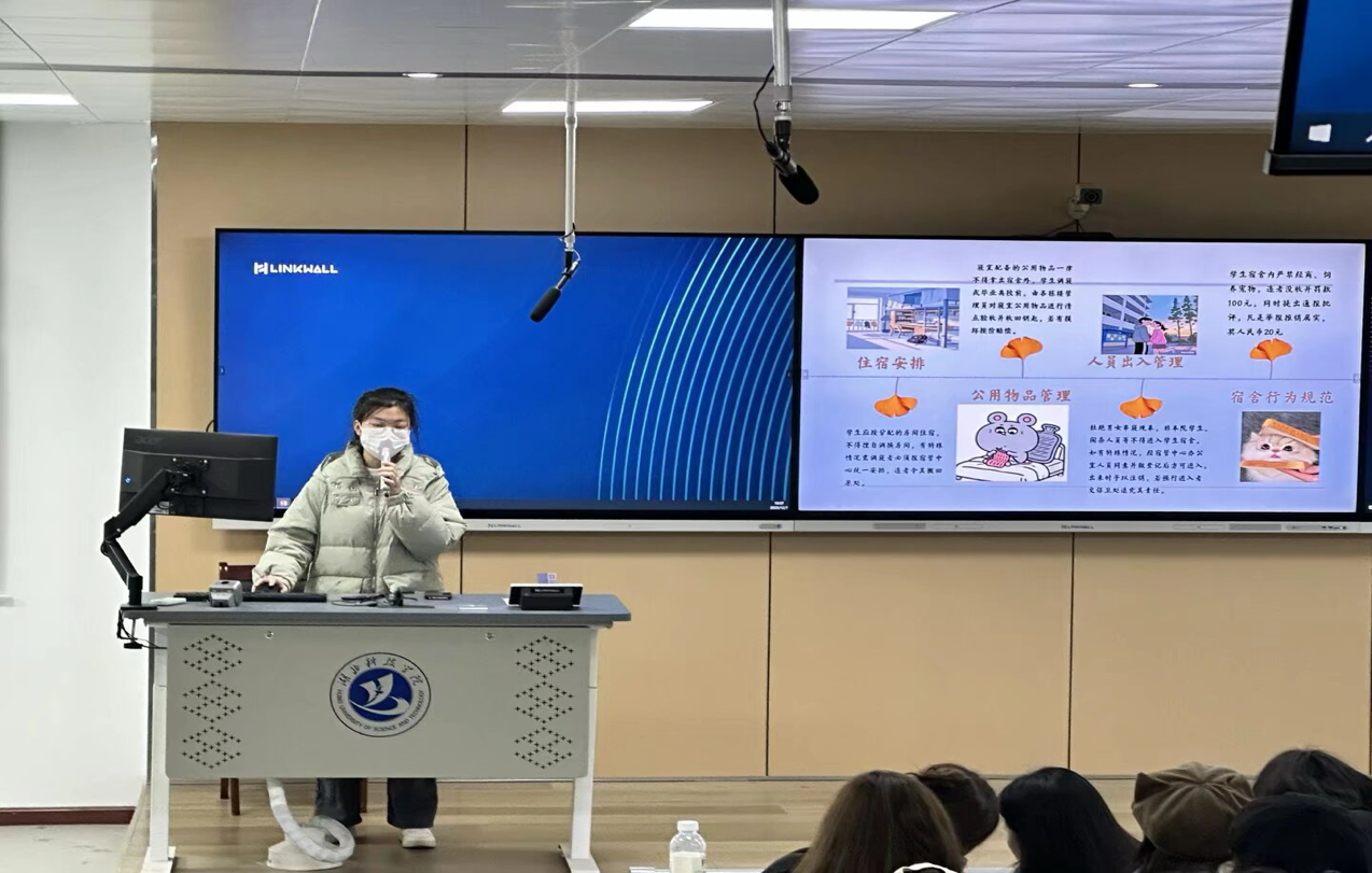 24级班会中,24小学教育1班陈黎姿以“耿耿园丁意,拳拳育人心”在讲台上,用时事热点联结专业思考,背后大屏的主题字样,既呼应着教育者的初心,也传递着学子对专业与时代的联结探索,让这场班会在严谨的规则宣更添了一份教育温度。 随后,24学前教育余婧玮围绕寝室安全展开详细说明。工作人员系统讲解住宿安排、公共物品管理、人员出入规范等寝室相关规定,特别强调电吹风、卷发棒等违规电器的禁用要求,明确违规使用将面临安全教育测试、宿舍断电及影响评优评先等后果,并公示安全保障人信息。针对寝室纠纷处理,提出“积极沟通、寻找共识、适度让步、及时求助”的解决思路,引导同学们和谐共处。