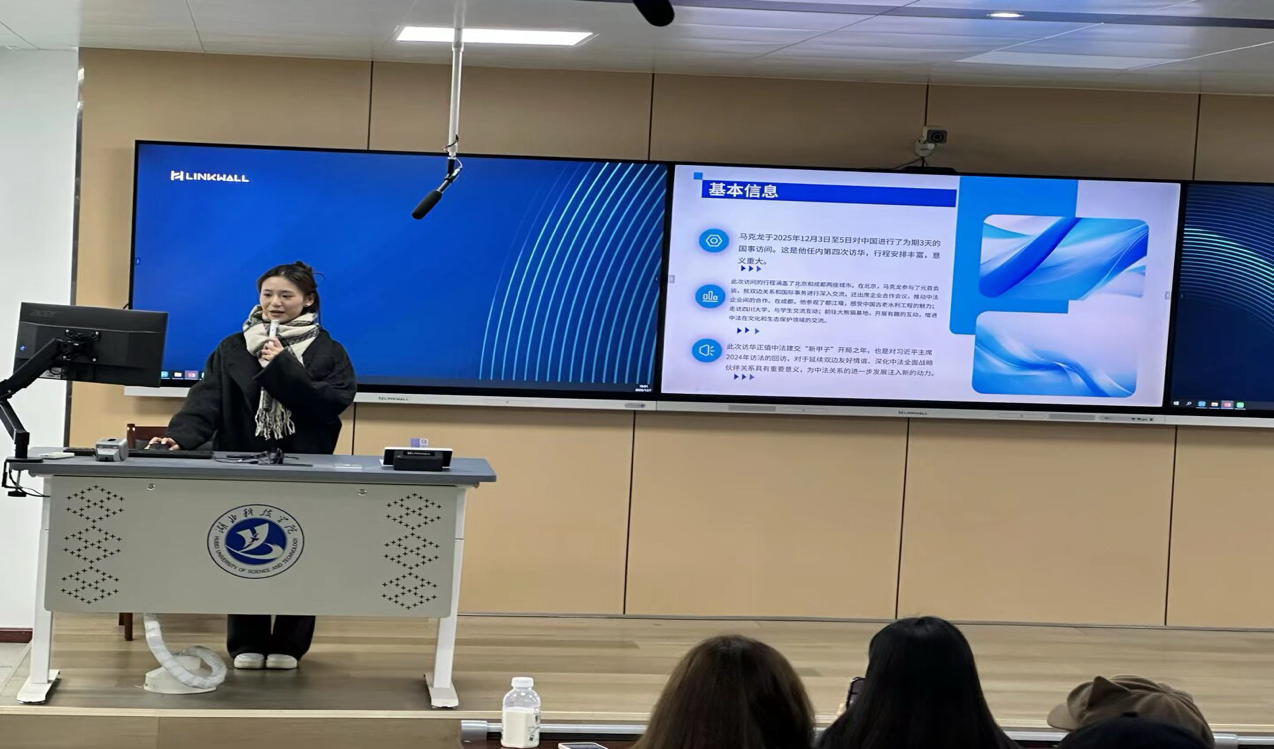 25级班会上,彭梦竹同学以“跨越山海的对话—马克龙2025年访华热点解读”为题分享时事热点。她从访华核心概况切入,重点剖析青年与教育交流亮点,结合学前教育专业特色解读事件带来的行业启示,为同学们搭建起“时事与专业”的联结桥梁,获得全场认可。