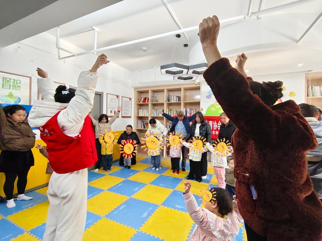 活动以趣味互动为切入点,打造沉浸式启蒙体验。暖场环节的《Hello歌》互动中,志愿者用童趣的语言和肢体动作引导孩子大胆自我介绍,稚嫩的表达不仅消除了孩子的陌生感,更培养了主动交往的意识;《大巨人和小矮人》音乐游戏里,亲子跟着节奏做伸展、蜷缩的动作,在肢体的张弛之间直观感受“大”与“小”的对比;《花园种花》韵律操则通过不同幅度的动作变换,让孩子在律动中进一步理解大小尺度的差异,肢体协调性也在互动中得到锻炼。