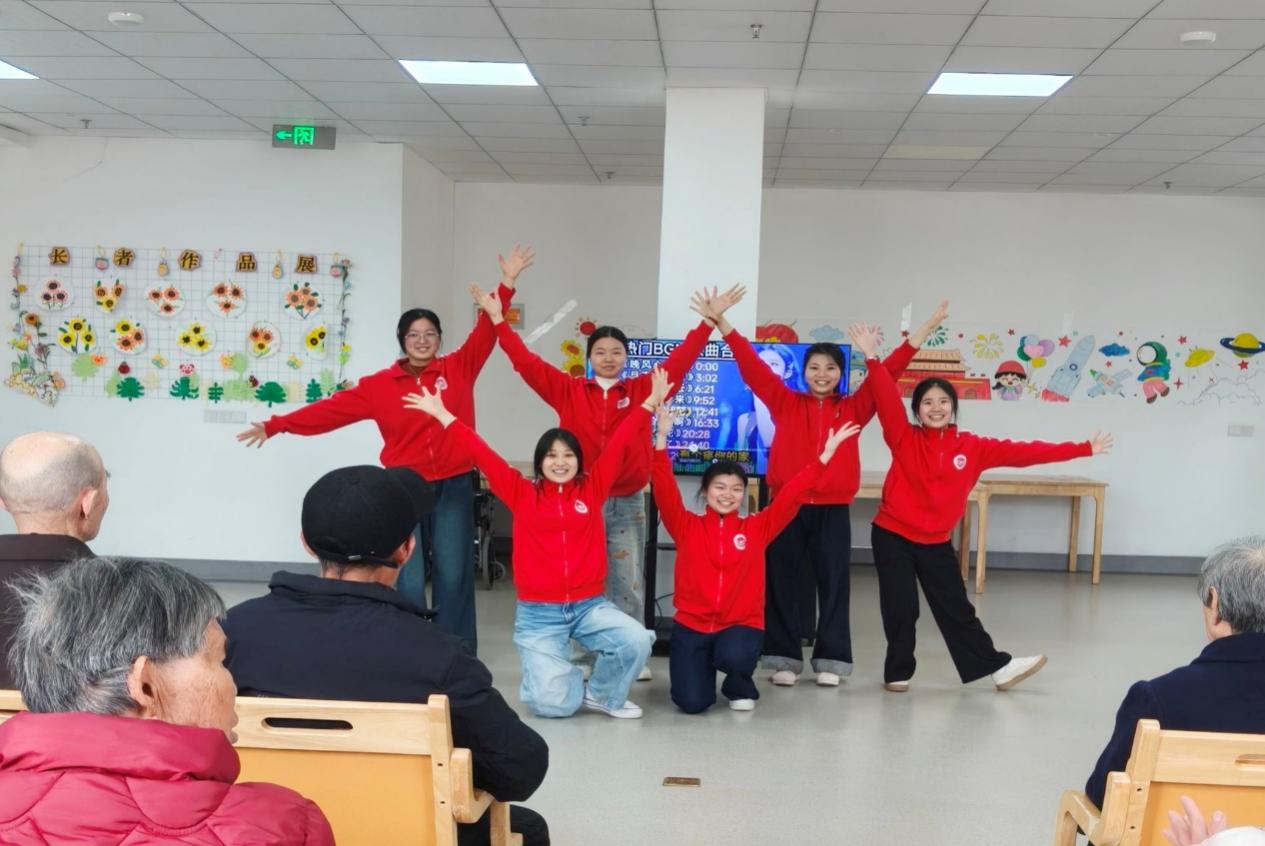 活动现场暖意融融、掌声不断。青马班学员精心筹备文艺节目,为老人们呈现一场温情满满的视听盛宴。灵动轻快的舞蹈展现青年学子昂扬向上的精神风貌,赢得老人们一致好评。合唱《走向复兴》《我会等》等歌曲,用真挚歌声传递温暖与牵挂,现场氛围温馨和谐。老人们认真聆听、面带笑意,跟随节奏轻轻拍手,两代人在歌声与欢笑中拉近心与心的距离。
