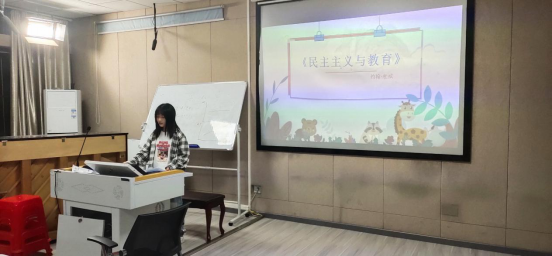 刘栎同学分享的是约翰•杜威的《民主主义与教育》一书。她从作者简介、内容介绍和自我感悟三个方面进行了分享。在作者简介中我们了解到我们熟知的教育家陶行知和胡适都曾师从杜威。在第二部分中分别介绍了书的四大部分和八个主要思想,其中主要分享了杜威的儿童中心论,就是学校组织生活要以儿童为中心,让儿童有自己选择的权利而不是全盘按照教师所想去完成某件事情。以及谈到环境创设的重要性,环境对儿童的影响非常大,所以必须重视环境的创设,给儿童创设一个积极的、有益于他们成长的环境。在感悟中主要谈到教育不应该是一味地灌输知识,而应该激发儿童的积极性和创造性,要考虑到儿童的需要,重视儿童。