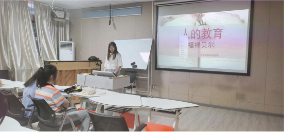 赵嘉瑞同学分享的是福禄贝尔的《人的教育》。她分别作者简介、作品简介、片段简析和个人感悟四个方面进行了分享重点阐述了福禄贝尔的教育主张。赵嘉瑞同学指出教育工作者应该反对教给儿童不能理解的概念,反对让学生呆读死记,应实施顺应儿童天性自然发展教育原则重视儿童自我的自由发展,积极鼓励儿童主动参与社会生活重点是把儿童培养成自由的、自觉行动的、有思想的人。