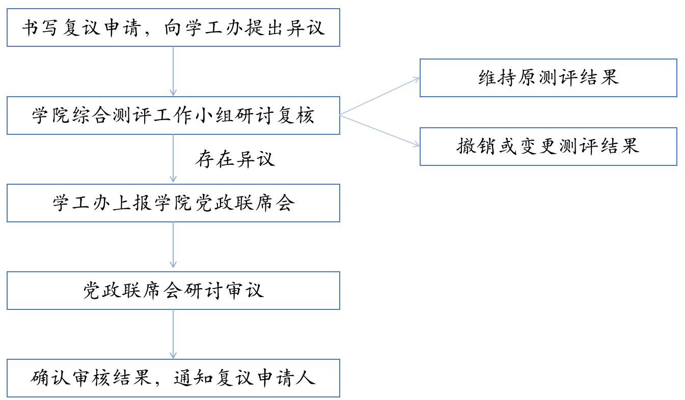 (五)复议处理:班级公示期间,由班级综测小组负责收集和回复异议或问题,不能确定的上报院学院综合测评工作小组;学院综合测评工作小组集体研讨后,仍然不能确定的异议或问题上报学院党政联席会议审议决定。