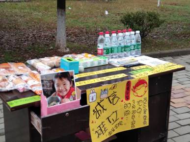 这是best365网页版团委学生会主办的诚信摊位活动,他们以院里为此次活动免费提供笔、笔芯、笔记本、固体胶、透明胶、纸、矿泉水和中百仓储低价出售面包作为活动物质,所得所有营业额捐给免费午餐用于给山区的孩子提供一份免费的午餐。