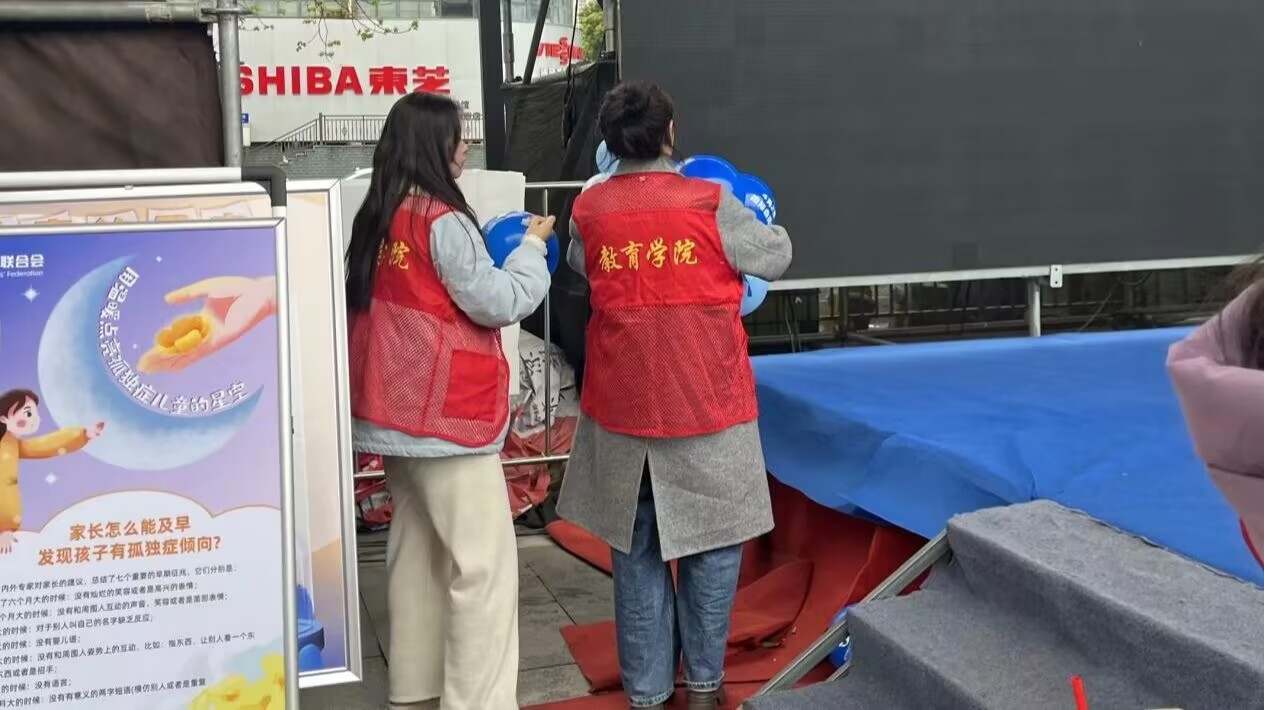 不仅如此,社团志愿者还与七彩梦的老师们一同在万达广场站点,向过往的行人分发蓝丝带、蓝色气球以及宣传单。希望通过这种方式,倡导全社会共同关注、关爱自闭症儿童。