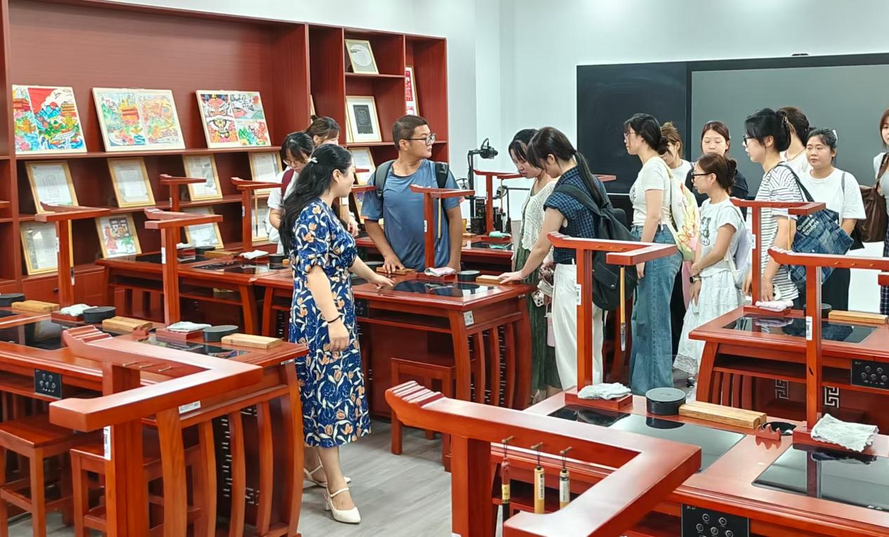 在实践认知环节,华晶晶老师带领全体新生前往学院技能中心参观实验室。从智慧书法教室的智能教学设备,到师范技能训练中心的模拟课堂场景,华老师逐一讲解设备功能与使用规范,新生们不时驻足观察、轻声提问,对专业实践平台充满好奇与期待。
