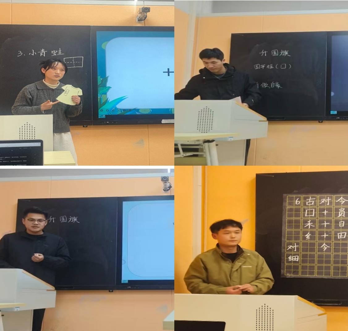 研课磨课,在模拟课堂中锤炼教学功底。活动围绕小学低年段语文教学目标,聚焦《小青蛙》《日月明》《升国旗》《古对今》四个经典篇目,精准对接低年级学生识字写字、朗读表达的核心学习需求。在课程团队的精心安排下,同学们以小组为单位分工协作,依次完成“说课+无生试讲”的教学展示。各组说课环节逻辑清晰,紧扣低段语文教学特点,详细阐述教学思路、学情分析、识字写字重难点及素养落地路径;无生授课环节充分模拟真实课堂场景,贴合低年级学生认知特点,有效运用趣味课前游戏、多样识字方法、分层朗读训练等策略,巧妙融入爱国主义教育渗透中华优秀传统文化,尽显对语文课程“工具性与人文性统一的理解与探索。这场沉浸式的实战演练,全方位检验了同学们的教材解读、教学设计与课堂驾驭能力,展现了同学们扎实的理论功底和教学设计与实施能力