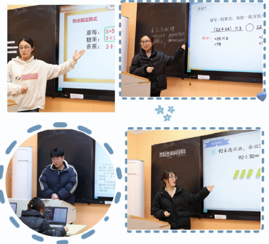 实战淬炼,以练促升显成效。本次实训紧扣小学数学数与运算核心教学内容,围绕《乘法的初步认识》《笔算除法》《乘法分配律》《分数乘法》四大重点课题展开。在章普老师的统一安排下,研究生们依旧延续第一期“两人一课、一说一讲”的特色展示模式:一人进行5—10分钟的说课,系统阐释教材分析、学情判断、教学目标设定、教学流程设计及设计意图,逻辑清晰、重点突出;另一人开展15分钟的无生试讲,完整呈现课堂导入、新知探究、巩固练习、小结提升等教学环节,全程模拟真实课堂场景。