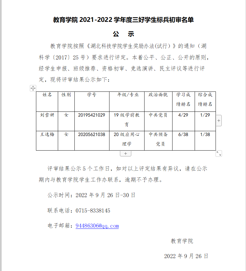 best365网页版2021-2022学年度三好学生标兵初审名单公示