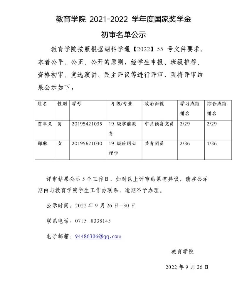 best365网页版2021-2022学年度国家奖学金初审名单公示