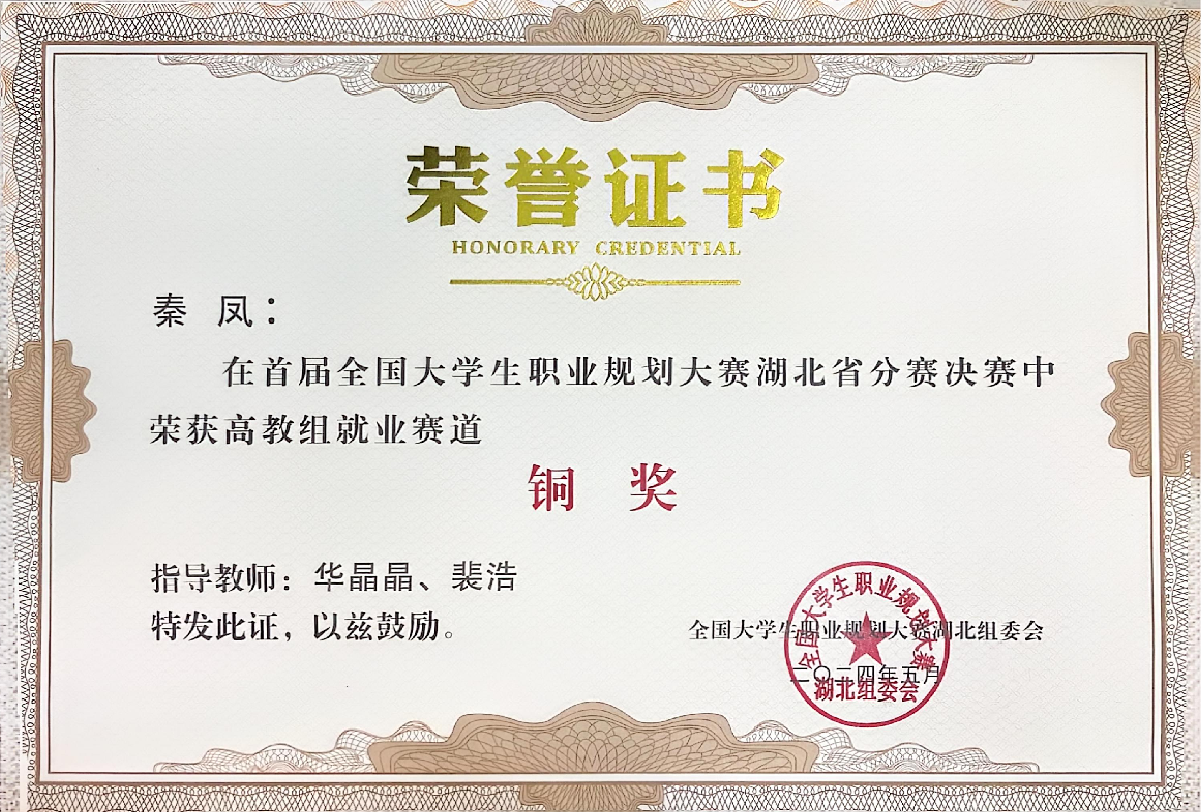 秦凤:全国首届大学生职业规划大赛湖北省分赛决赛高教组就业赛道铜奖