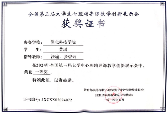 黄瑶:全国第三届大学生心理辅导课教学创新展示会一等奖