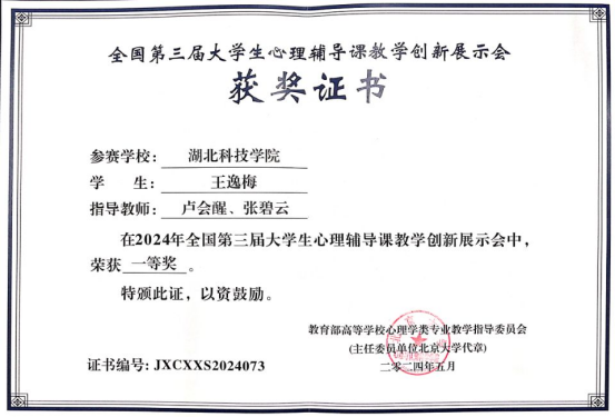 王逸梅:全国第三届大学生心理辅导课教学创新展示会一等奖