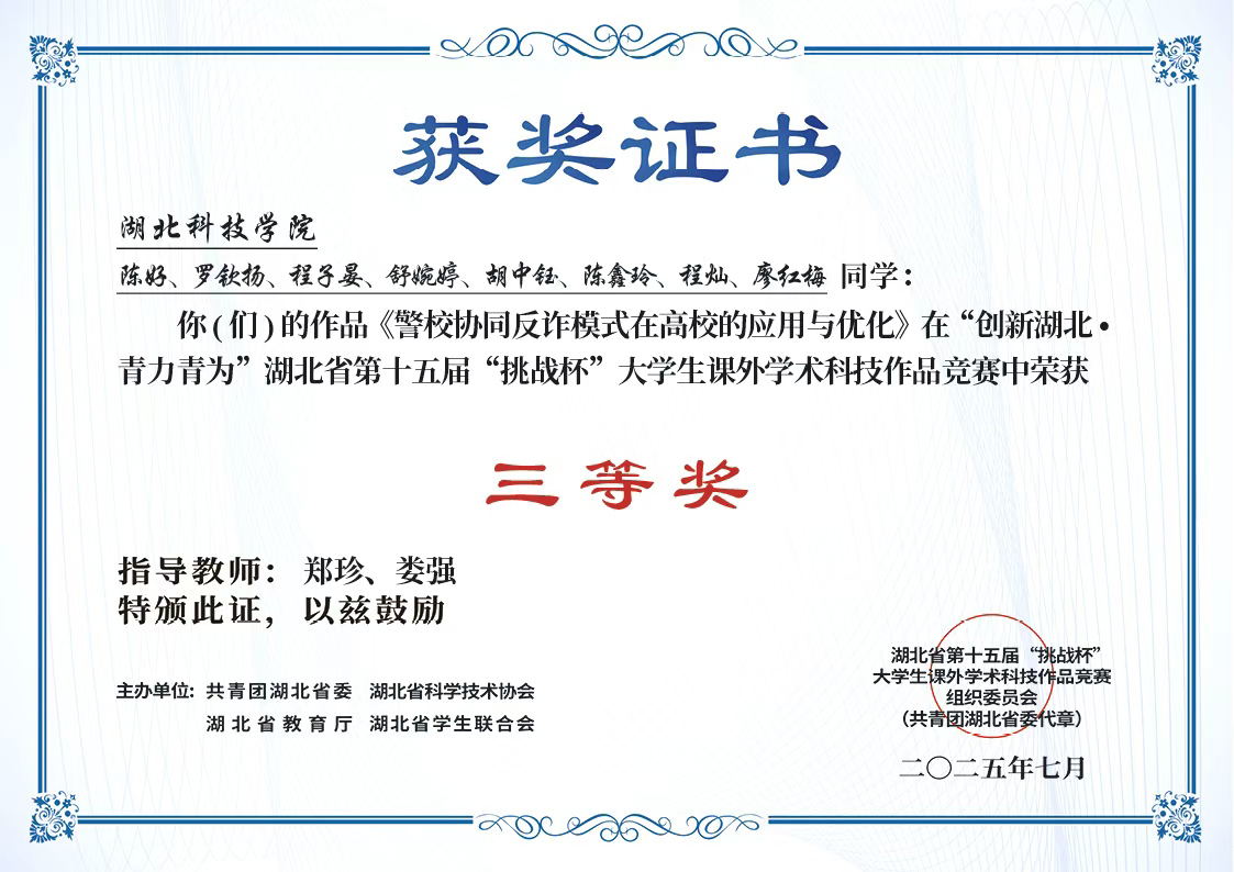 陈好、罗钦扬、程子晏、舒婉婷、胡中钰、陈鑫玲、程灿、廖红梅:湖北省第十五届“挑战杯”大学生课外学术科技作品竞赛三等奖